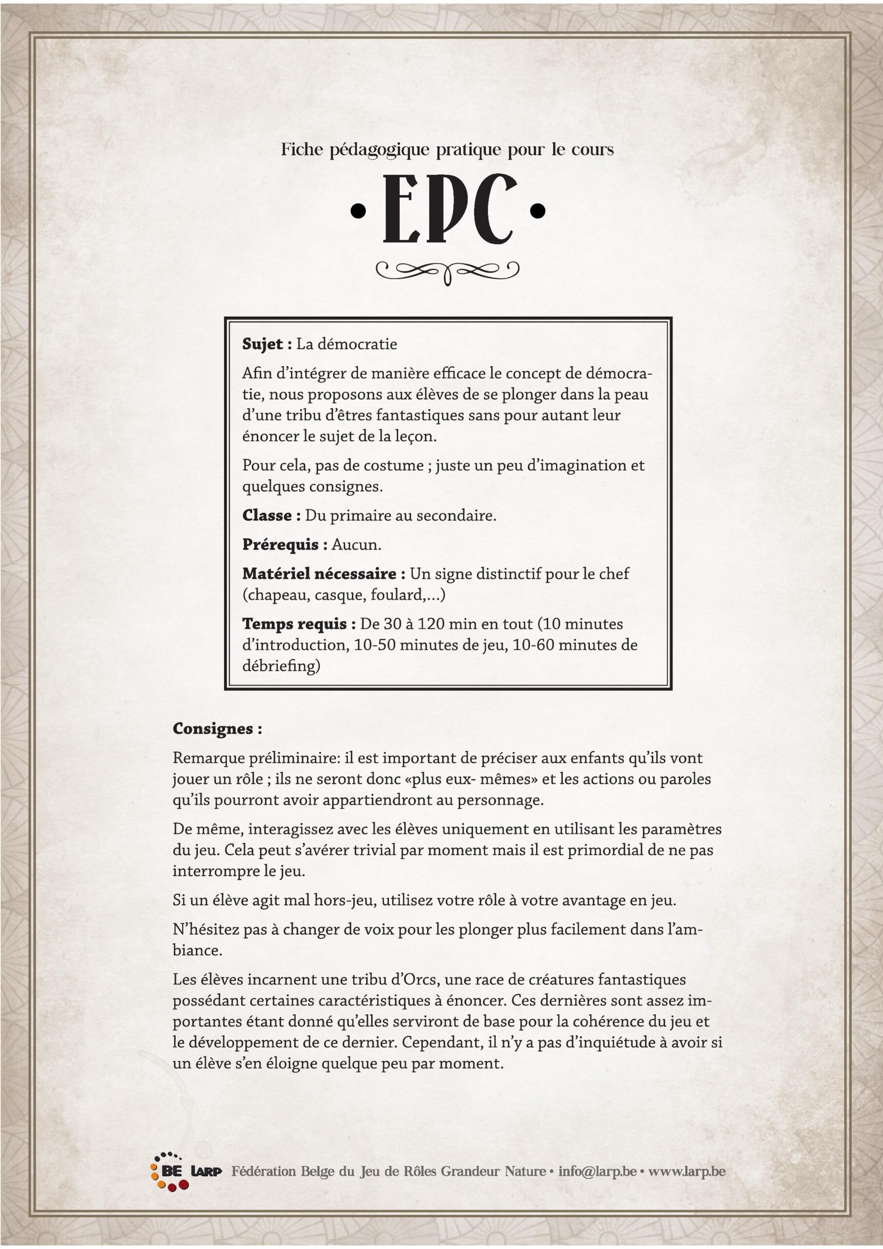 Afin de promouvoir les qualités éducatives et pédagogiques du jeu de rôles grandeur nature, BE Larp met à disposition des enseignants et futurs enseignants des fiches pédagogiques à utiliser en classe.